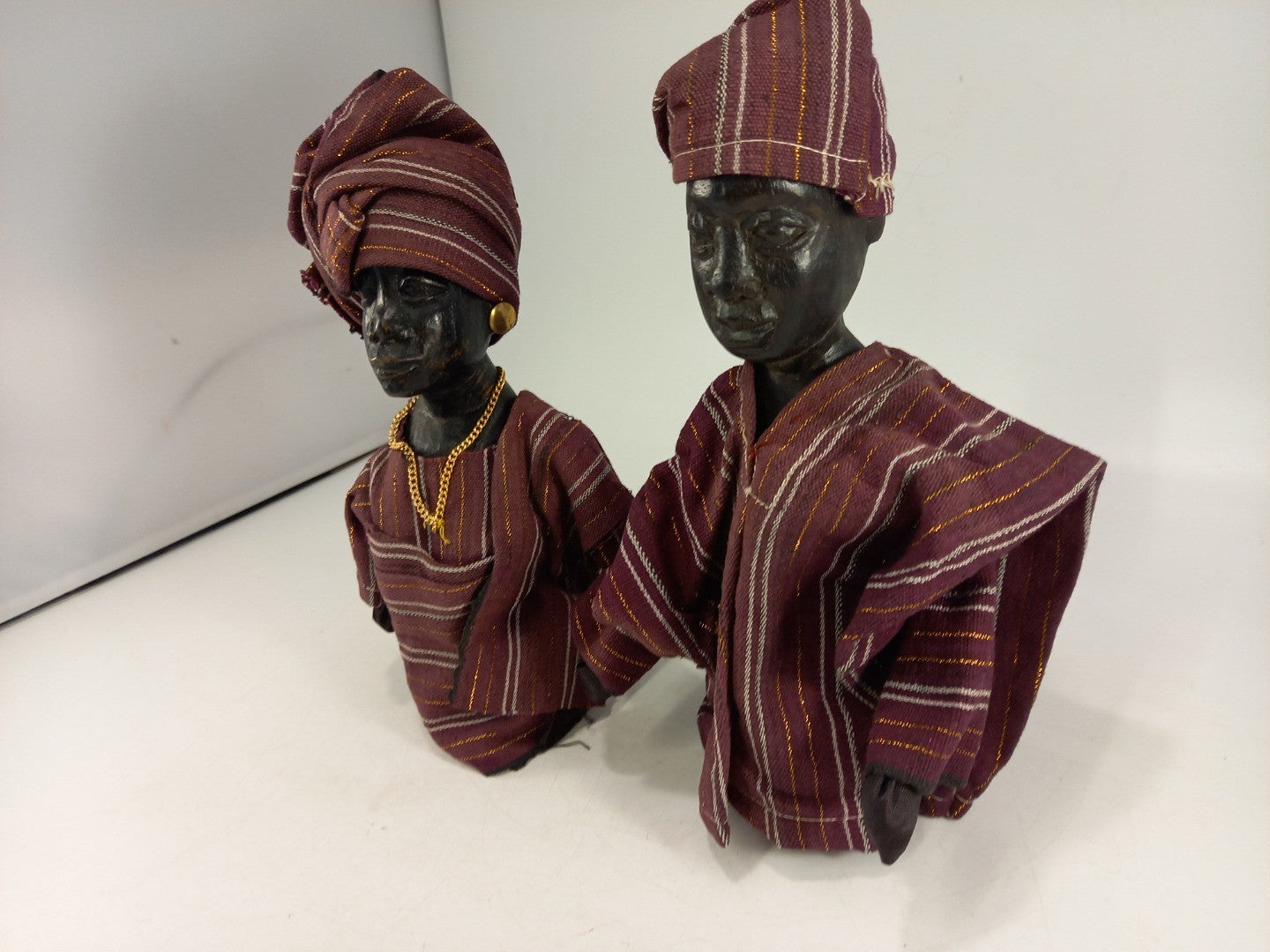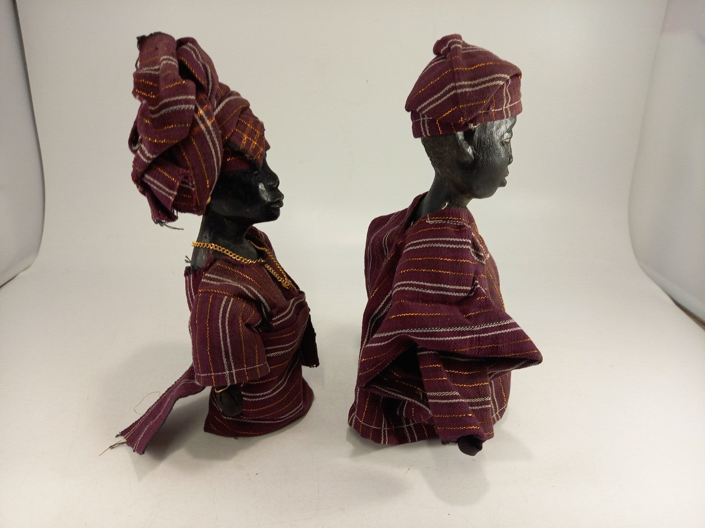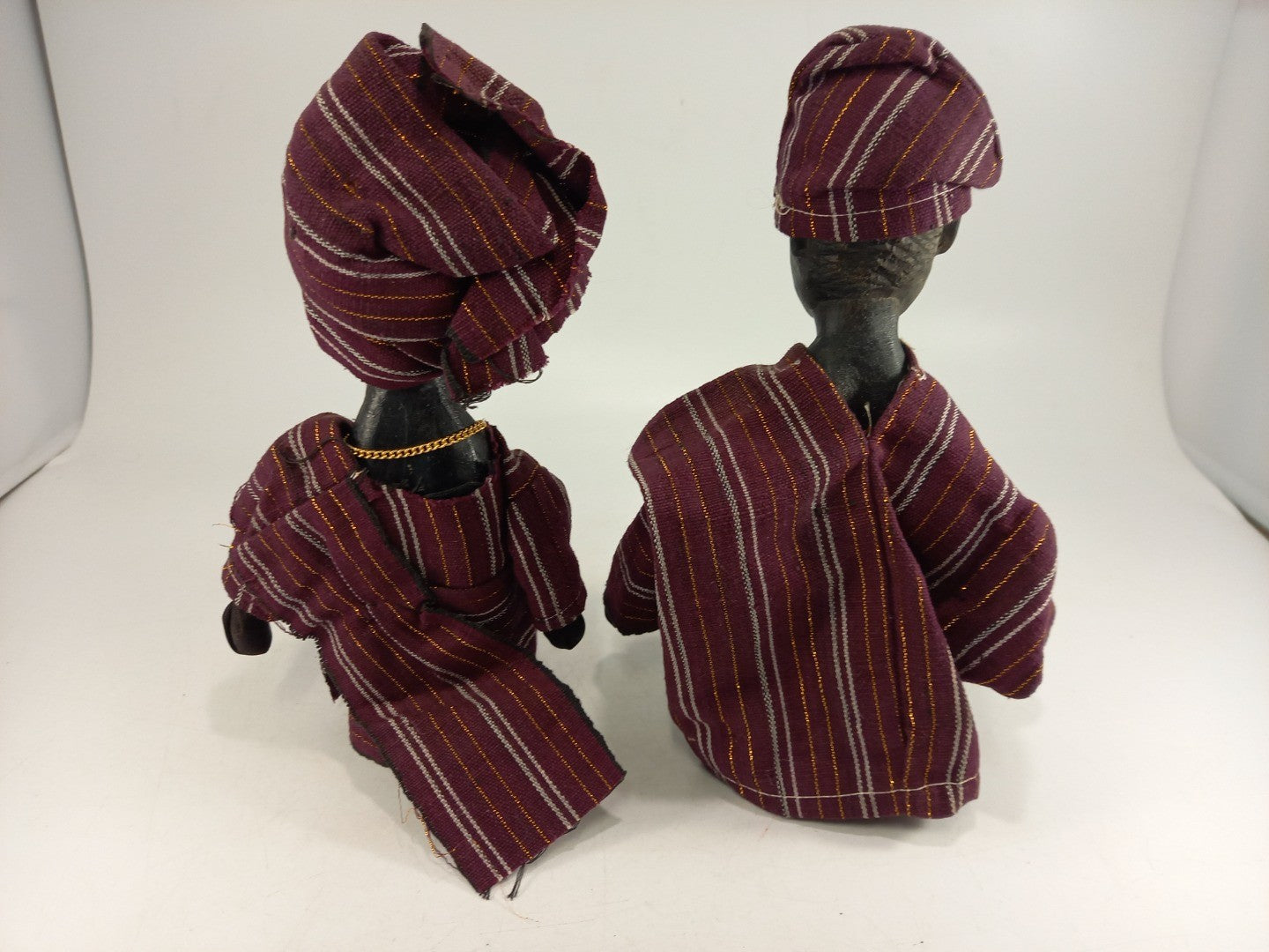 Pair of Hand Carved Fruit Wood Busts Traditional Clothing 8" Tall VGC
