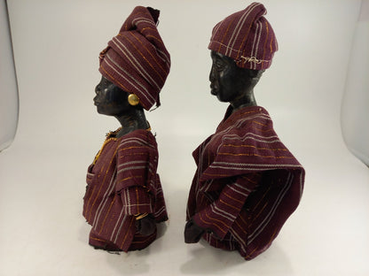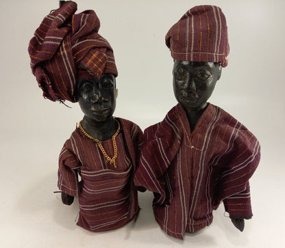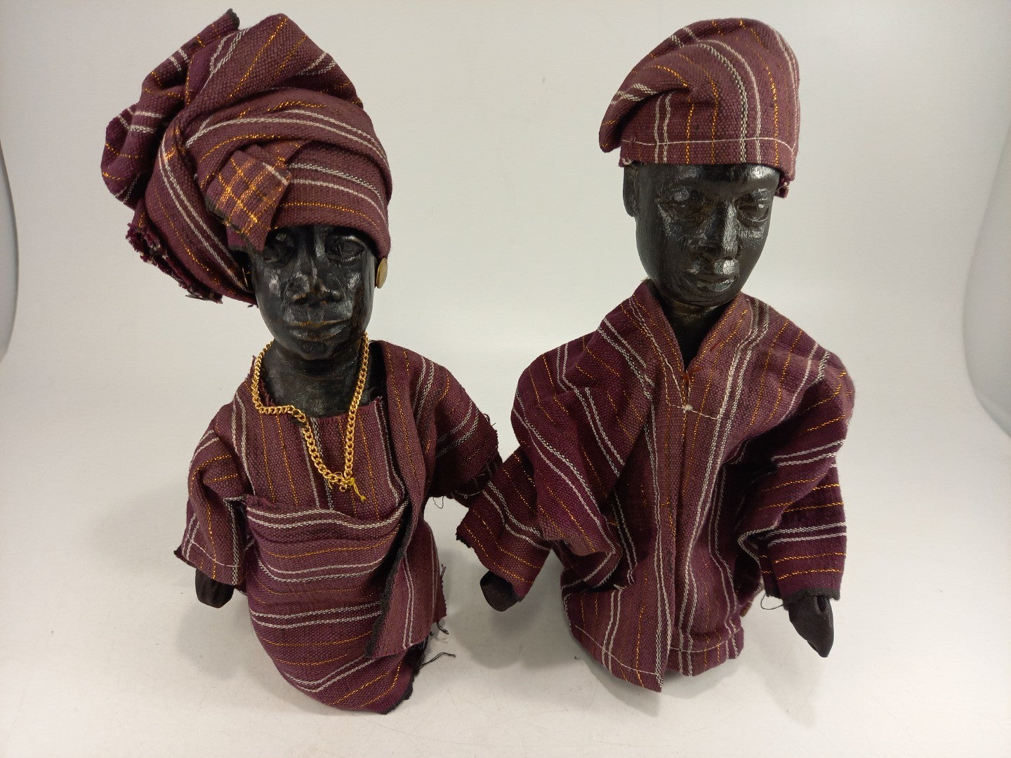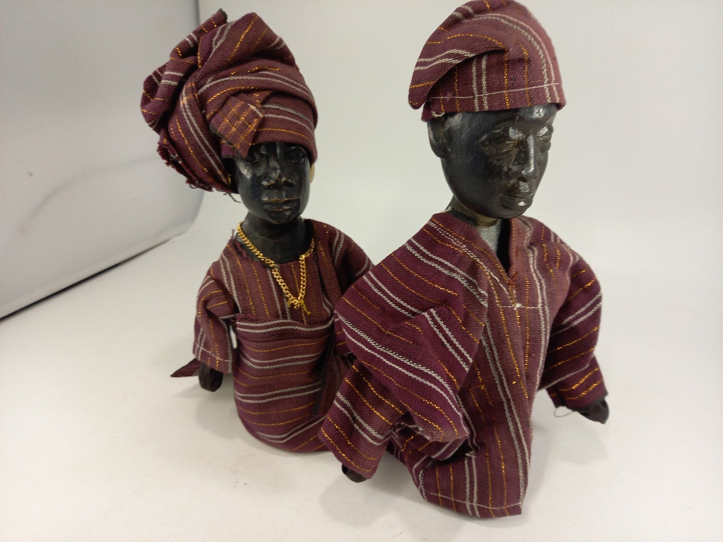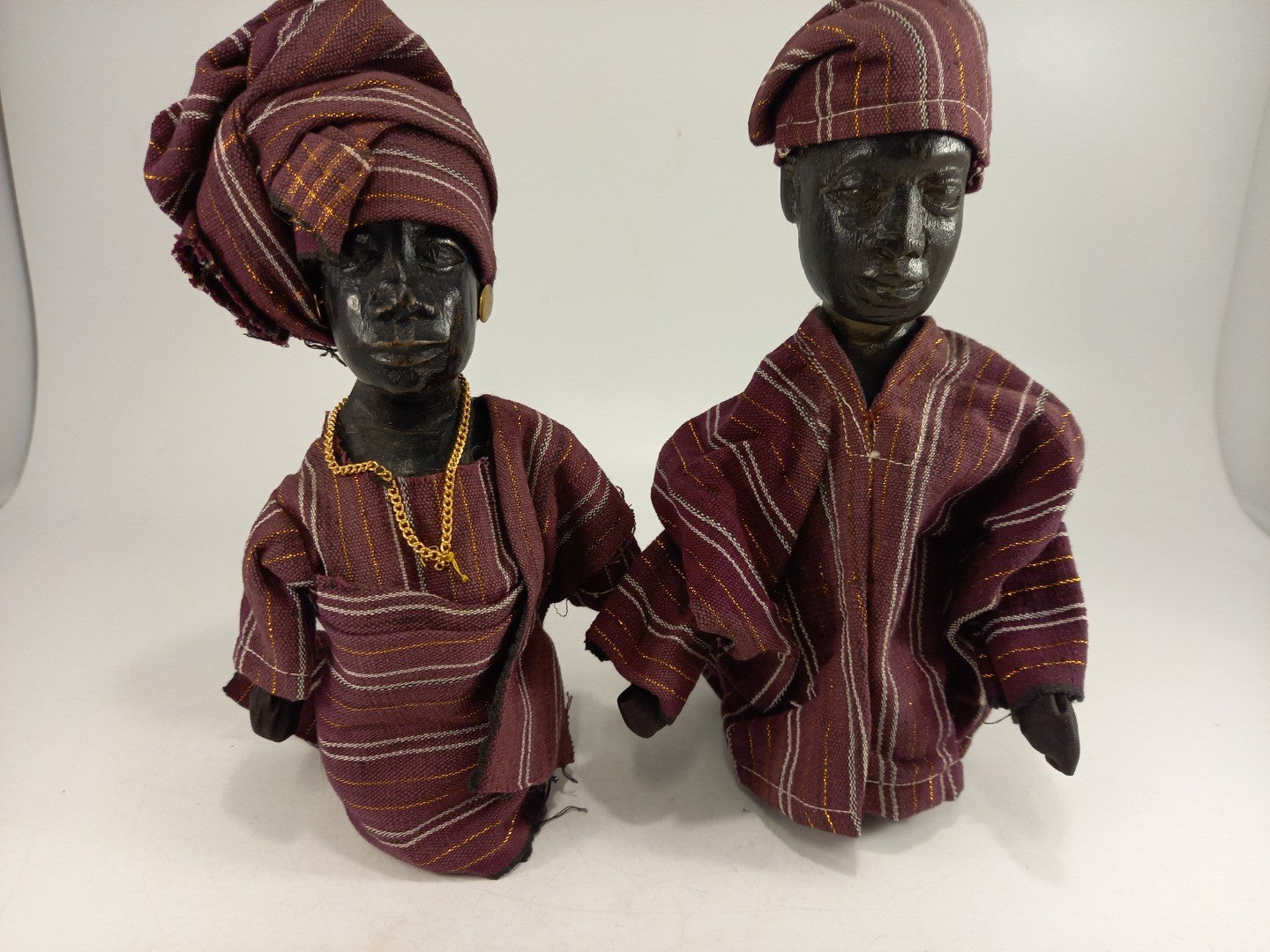 Pair of Hand Carved Fruit Wood Busts Traditional Clothing 8" Tall VGC